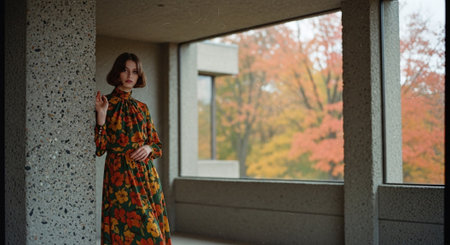 A stylish autumn dress neatly hung on a hanger in a cozy room with a large window. Outside the window you can see falling foliage, creating an atmosphere of comfort and style. The designer details of the dress are clearly visible