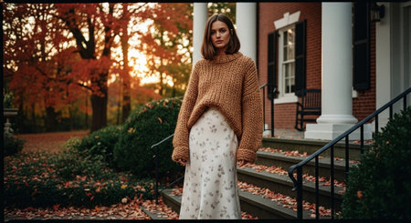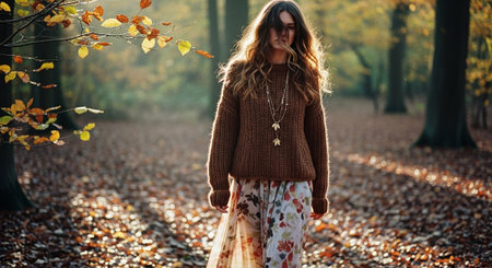 A woman with wavy hair wearing an oversized sweater, posing outdoors in a park during autumn, surrounded by colorful trees