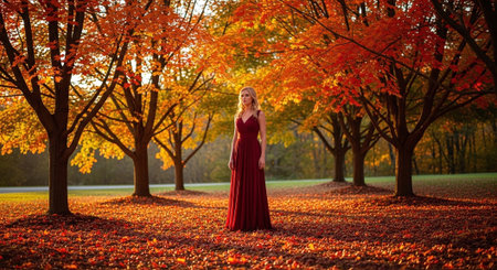 Beautiful young woman in a long red dress in autumn park.