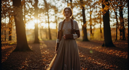 Beautiful young woman in a long medieval dress in the autumn forest