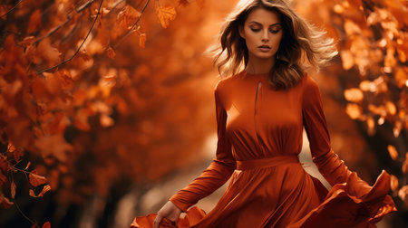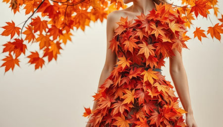 A woman is wearing a dress made of leaves. The leaves are orange and are covering her body