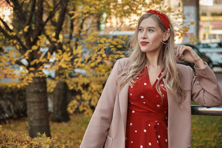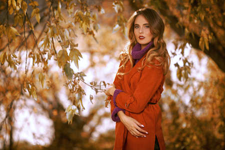 Beautiful young woman is posing in the autumn park. Autumn beauty, fashion.