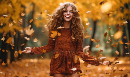 Generative AI : Happy girl throws up autumn leaves in the park for a walk outdoors
