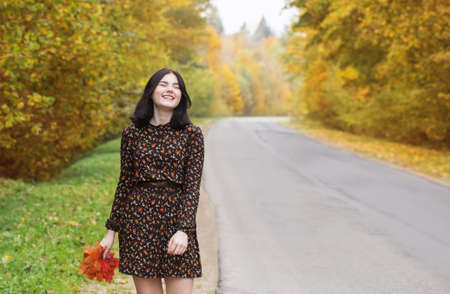 Portrait of a beautiful brunette woman in the autumn park.