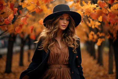 Blonde girl with curls in a hat and dress on the background of trees with orange leaves. Autumn season concept. Generative AI