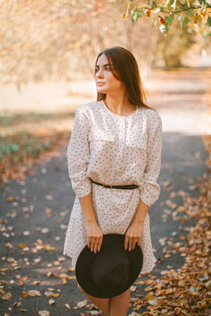 Autumn portrait of a beautiful young woman in a hat and dress.