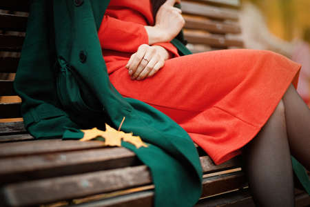 Woman in orange dress and green coat sitting on park bench outdoor. Autumn fashion
