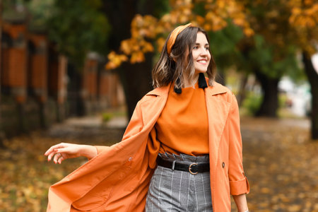 Beautiful young woman walking in the autumn park. Autumn fashion.