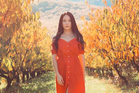 Young beautiful brunette woman in a long red dress walking in the autumn park