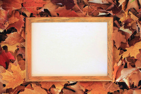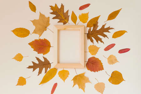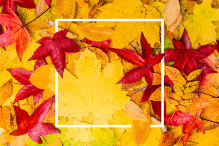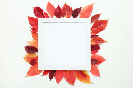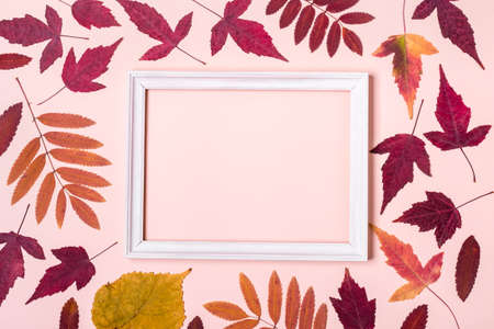 Red, orange, yellow and green autumn leaves background with white frame made of wood. Minimal concept idea.