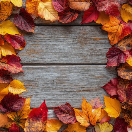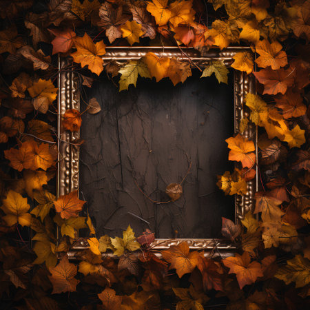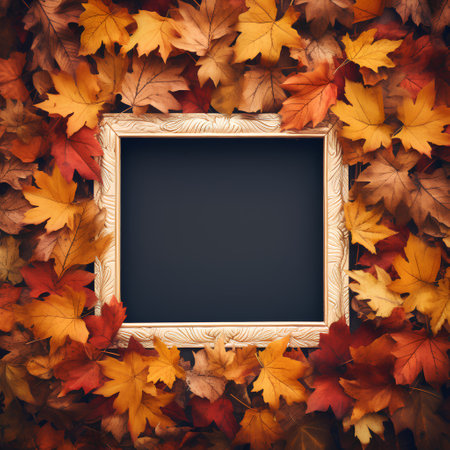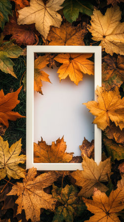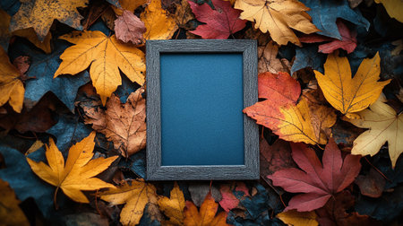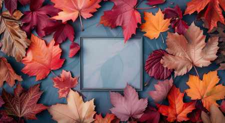 Vibrant autumn leaves in shades of orange and yellow frame a blank square in a forest setting, calling for creative inspiration and ideas.