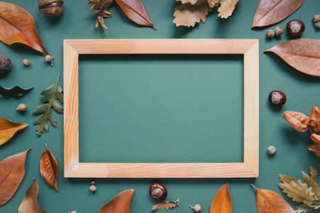 Minimal style composition made of dried leaves and a wooden frame. Autunm and fall concept. Creative layout. Flat lay, top view, copy space. Trendy colors