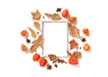 An empty photo frame, dry maple and oak leaves, physalis, seeds and stars of anise are on a white background. Autumn, fall, thanksgiving day concept. Flat lay. Top view. Copy space.