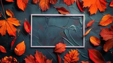 A vibrant frame of autumn leaves in rich orange, red, and yellow hues, creating a beautiful border against a teal backdrop.