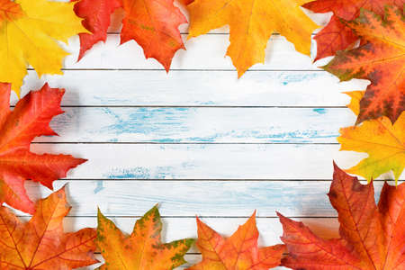 Colorful fallen maple leaves border on vintage white and blue wooden background with copy space for text. Seasonal autumn background, design mock up