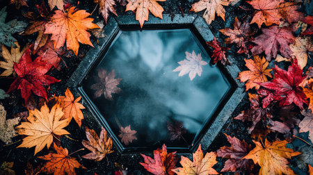 This serene image captures the beauty of autumn leaves in vibrant colors surrounding a hexagonal pond. The calm water reflects the stunning foliage, creating a peaceful outdoor scene perfect for nature lovers and photographers.