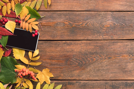 e-commerce autumn leaves wood background concept. Smartphone technology.