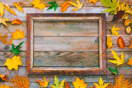 autumn composition. bright autumn leaves and picture frame on wooden background with copy space. mock up for text, congratulations, phrases, lettering