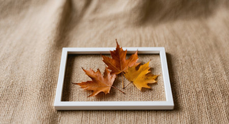 Minimal concept. Dry leaves on a white backdrop with a picture frame.