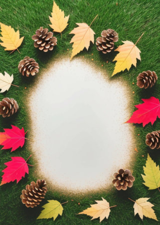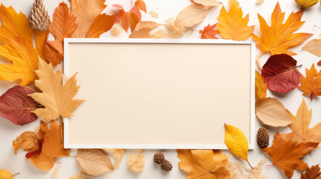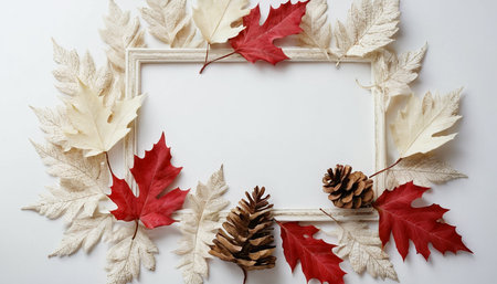 A white rectangular frame is surrounded by a border of autumn leaves in shades of red and cream, along with several brown pine cones. The leaves are arranged in a decorative pattern, with some overlapping the frame. The background is a plain white surface.