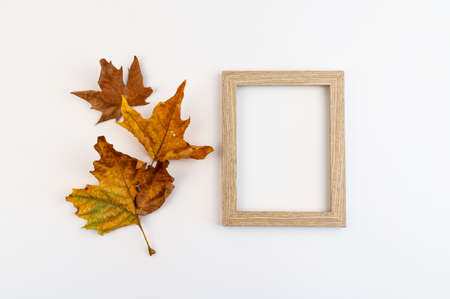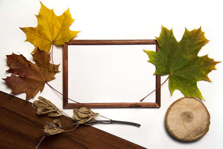 Blank brown frame, maple leaves and wood on white and brown background. Top view flat lay autumn nature composition. Mockup scene.
