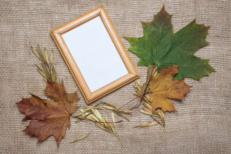 Blank yellow frame, red maple leaves and seeds on brown sackcloth background. Top view flat lay autumn nature composition. Mockup scene.