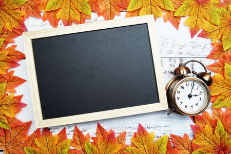 Empty space for copy with alarm clock and maple leaves border frame on wooden background