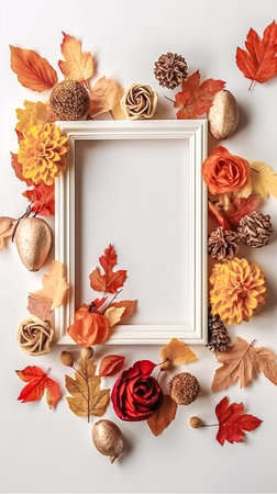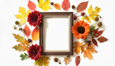 Autumn themed photo frame with flowers and leaves on a white background representing the concept of fall and Thanksgiving