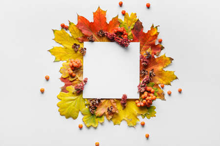 Mock-up scene. Blank yellow frame, maple, rowan and ivy leaves, on white background. Flat lay, top view. Autumn nature style.
