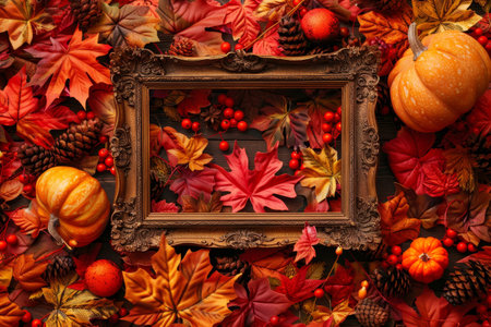 A stylish wooden frame surrounded by various autumn elements on a marble surface. Perfect for seasonal designs, warm themes, and creative projects.