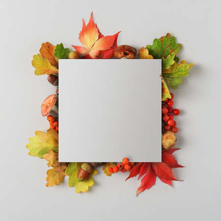 Mockup square white frame with with colorful autumn leaves and pumpkins on a white background