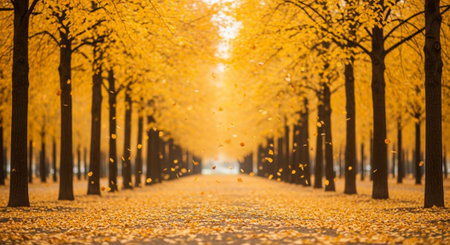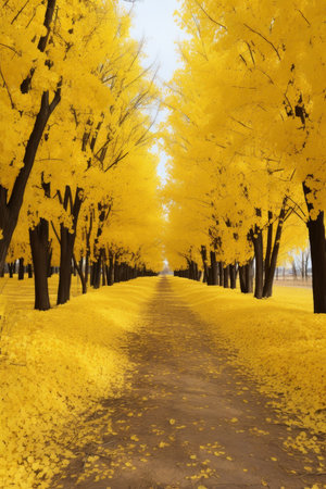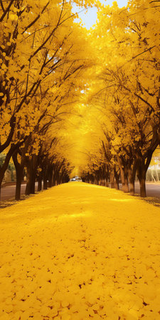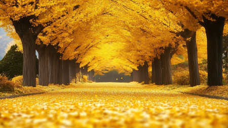 A vibrant autumn scene unfolds as radiant yellow trees form a breathtaking natural pathway through a park The golden canopy creates a stunning spectacle, highlighting the beauty of the changing seasons Sunlight filters through the leaves, casting a warm glow upon the path below This picturesque scene captures the essence AI Generative