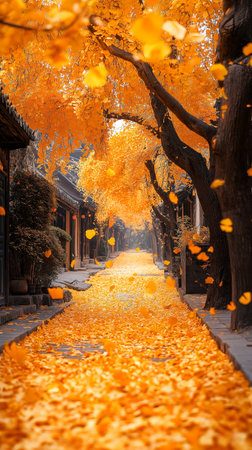 Experience a beautiful, vibrant ginkgo tree tunnel filled with golden-yellow leaves, ideal for a romantic stroll or serene nature moments during autumn.