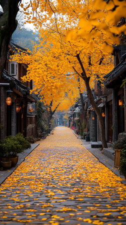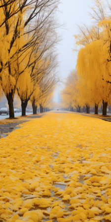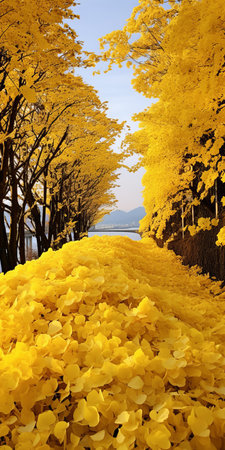 yellow leaves cover the ground on the street, creating a contemporary candy-coated scene reminiscent of traditional chinese landscape paintings. this psychedelic surrealism, captured in an associated press photo, features a monochromatic scheme that enhances the romantic riverscapes. this captivating image could easily grace the pages of national geographic. ai generated