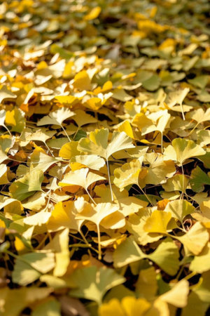 Ginkgo leaves on the ground in the park. Autumn background