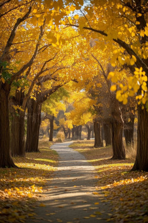 A stunning view of a vibrant autumn pathway lined with golden trees, creating a peaceful and inviting atmosphere, perfect for nature lovers and photographers.