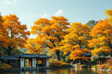 Autumn Chinese garden lakeside scenery