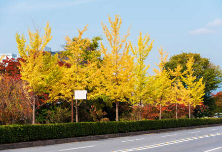 Ginkgo trees along the road in autumn, Yamanashi, Japan