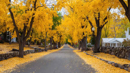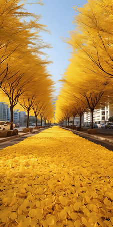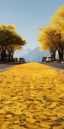 gingko boulevard with blustery winds, adorned by jasmine trees on either side. the road is painted in a golden hue, covered with yellow jasmine biloba leaves. in the distance, a majestic mountain stands tall. this real shot captures the beauty of jasmine biloba in ultra-high resolution. ai generated