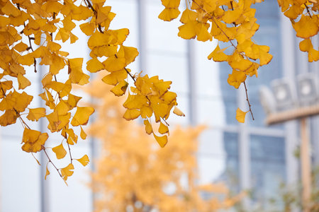 Bright yellow leaves of a ginkgo biloba tree in an urban situation