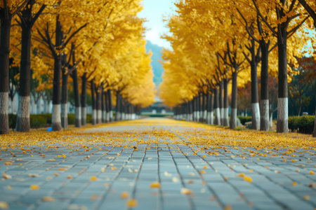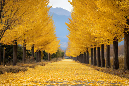 gingko boulevard: a picturesque road lined with succulent trees, displaying a stunning golden hue. the ground is adorned with yellow succulent biloba leaves, creating a vibrant carpet. in the distance, a majestic mountain adds to the scenic beauty. this real shot captures the essence of the succulent biloba in ultra-high resolution. ai generated