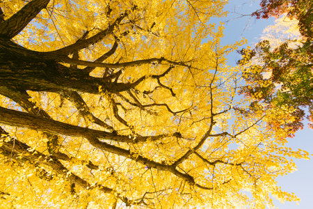 Ginkgo trees with yellow leaves in autumn park, South Korea