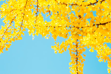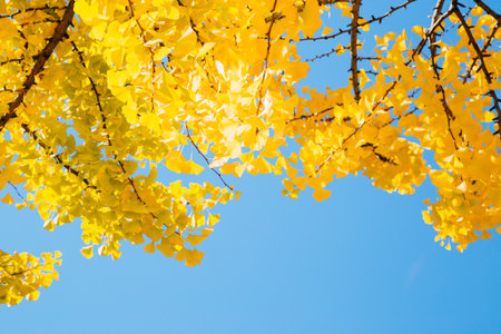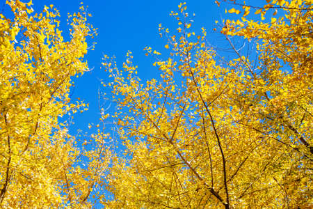 yellow ginkgo leaves against blue sky. Colorful falling foliage in the garden, natural background banner for Autumn season and seasonal change concept