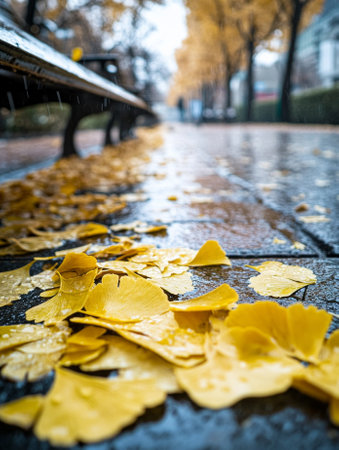 Close-up of yellow ginkgo leaves on a rainy urban sidewalk.