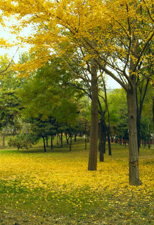 Autumn in Beijing park, golden ginkgo trees in the background of green pines and grasses