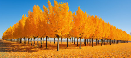A stunning row of golden-leaved trees creates a vibrant natural corridor, while bright sunlight illuminates the landscape beneath a clear blue sky, showcasing the beauty of autumn.
