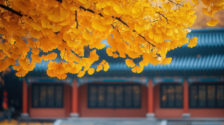 Ginkgo biloba leaves in front of chinese temple in autumn