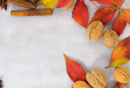 autumn background. Autumn leaves, walnuts and cinnamon sticks with copy space.
