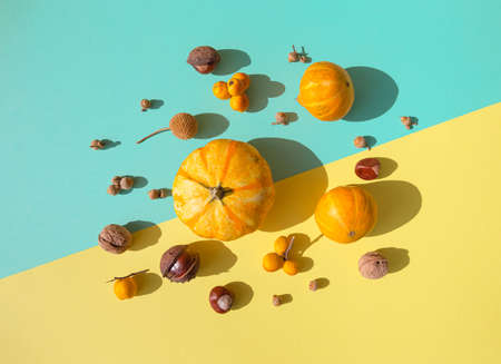 Autumn creative composition made of pumpkin, nuts and acorns on colorful geometric background. Autumn, fall, halloween concept. Flat lay, top view.