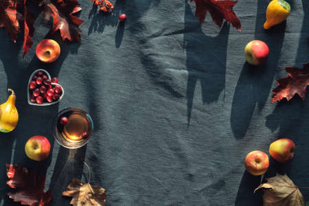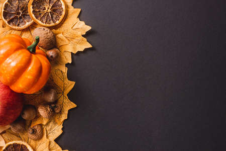 Autumn composition on dark background, top view. Space for text